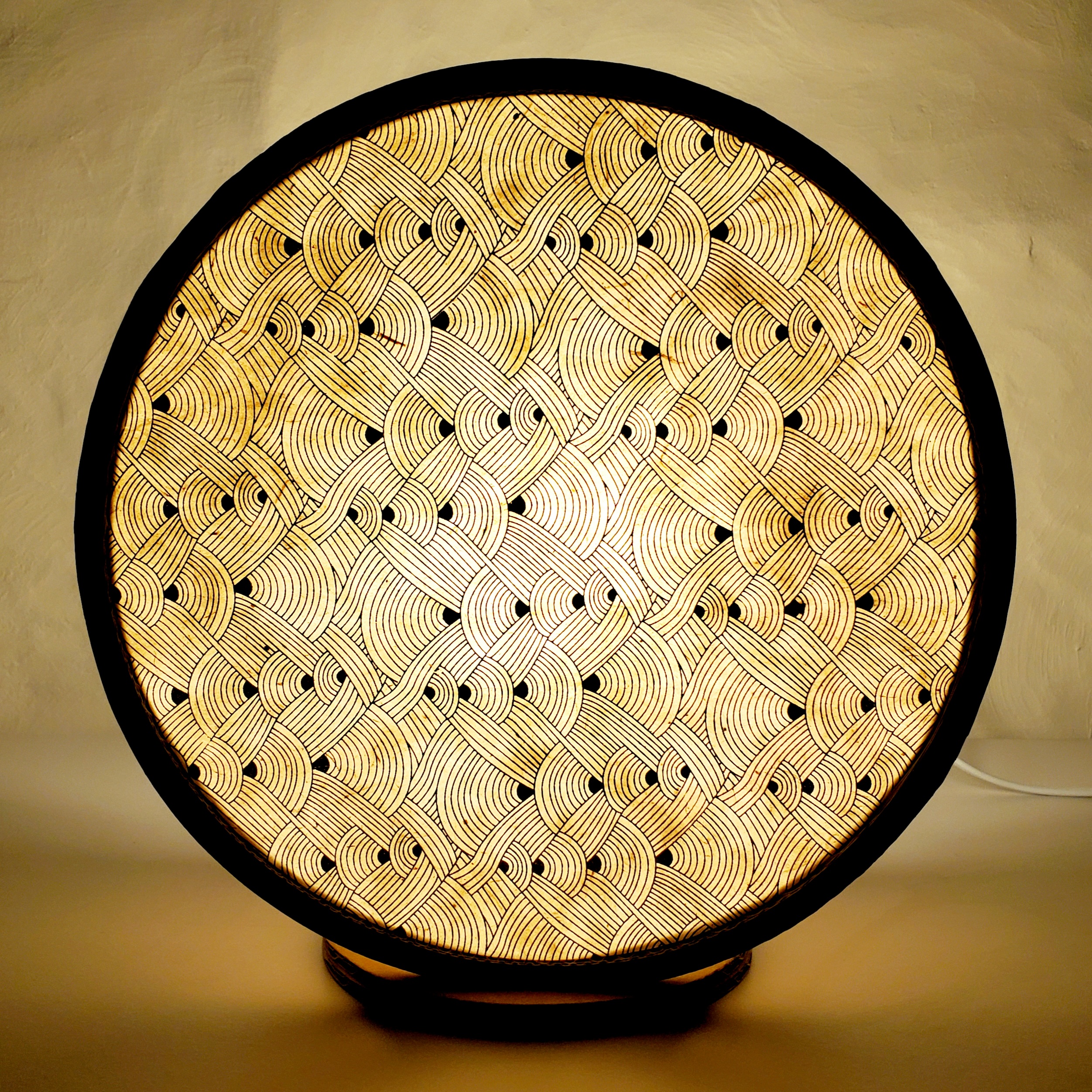 Entièrement réalisée à la main dans mon atelier, la lampe mesure 25 cm de diamètre et 11 cm de largeur. Elle est habillée de papier népalais collé sur du polyphane. Avec une ampoule LED E14, elle est une parfaite lampe d’ambiance qui mettra une touche de couleur et de chaleur dans votre intérieur.