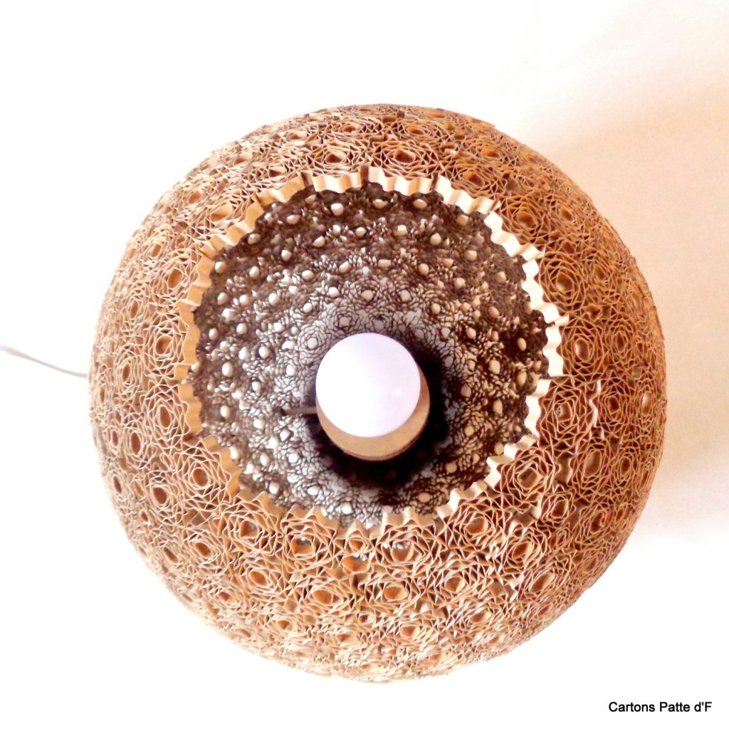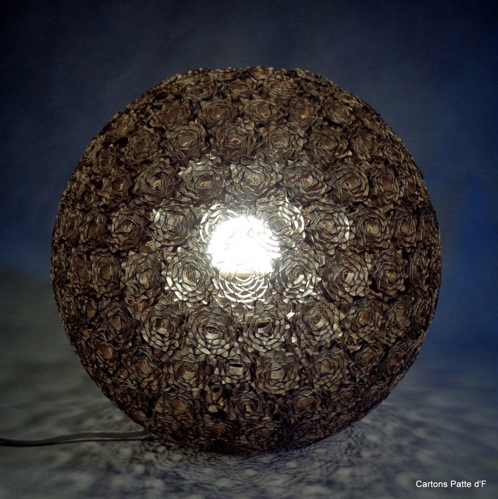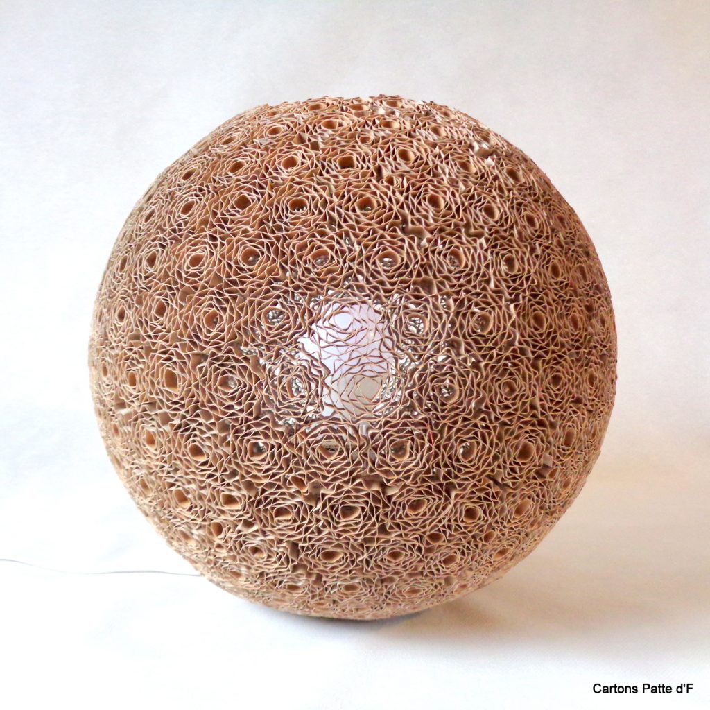 Cette grande lampe à poser est réalisée entièrement à la main à partir de carton de récupération. Toutes les lamelles ont été découpées au cutter puis assemblées à la main.
