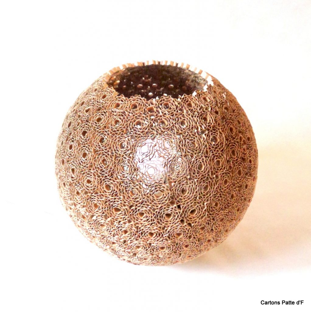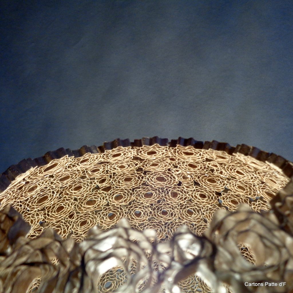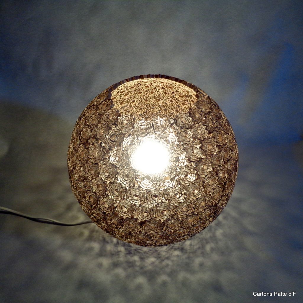 Cette grande lampe à poser est réalisée entièrement à la main à partir de carton de récupération. Toutes les lamelles ont été découpées au cutter puis assemblées à la main.