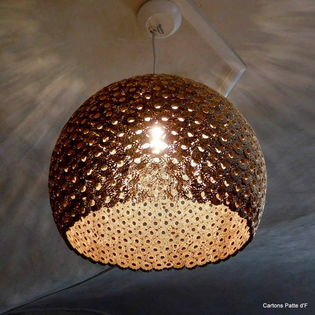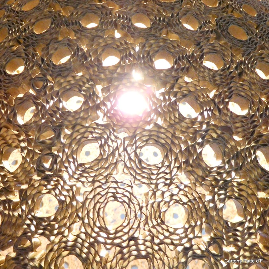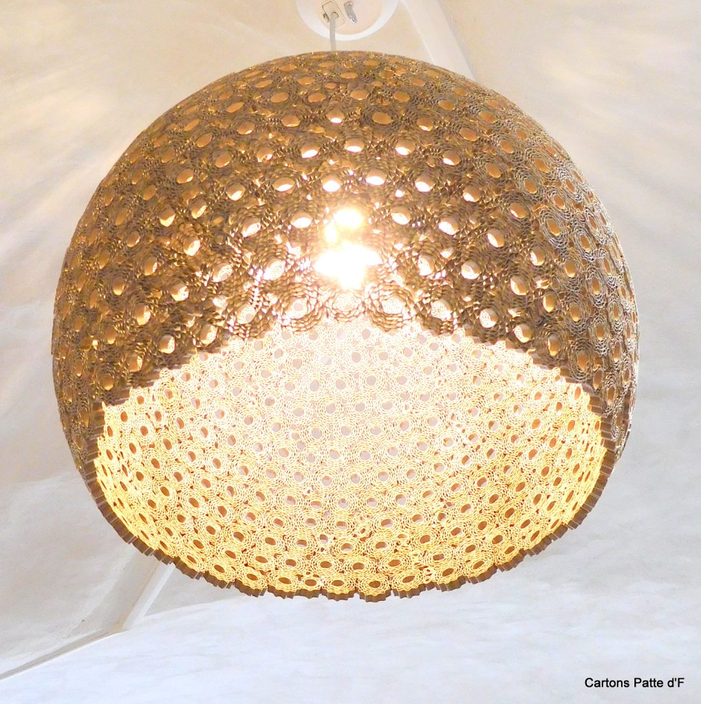 Cette suspension géante est réalisée entièrement à la main en carton. Avec ses spirales de carton, elle diffuse une lumière tamisée idéale pour un salon ou une chambre. Toutes les spirales ont été découpé au cutter et assemblé à la main.