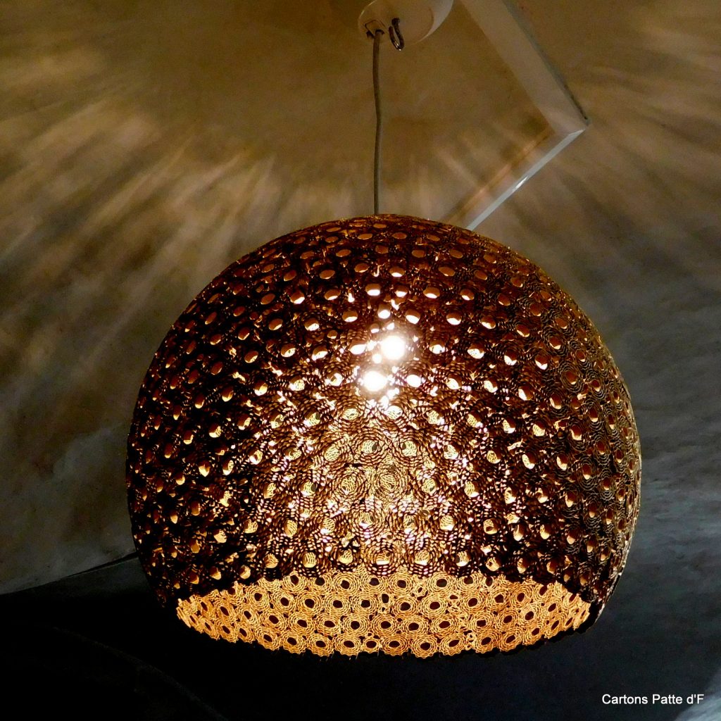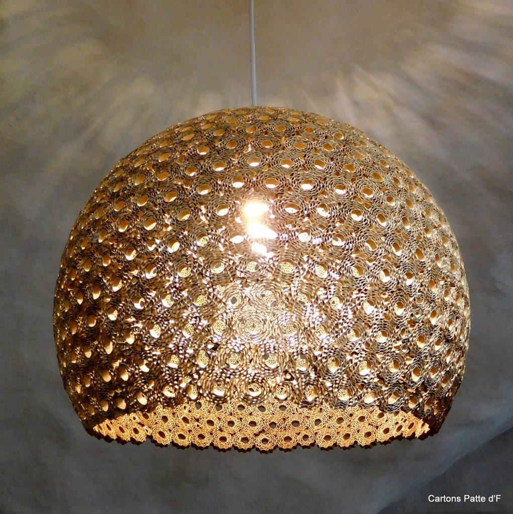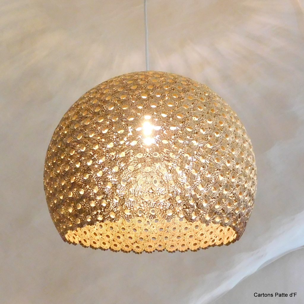 Cette suspension géante est réalisée entièrement à la main en carton. Avec ses spirales de carton, elle diffuse une lumière tamisée idéale pour un salon ou une chambre. Toutes les spirales ont été découpé au cutter et assemblé à la main.