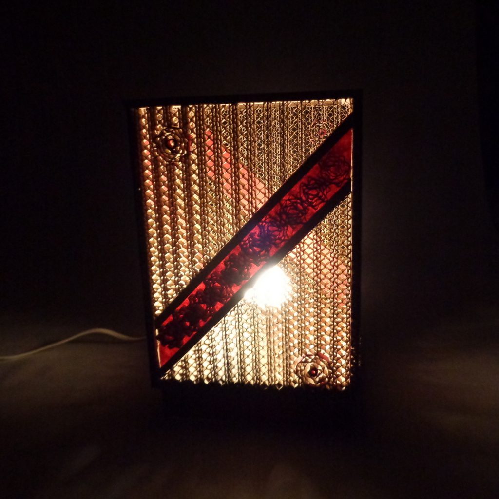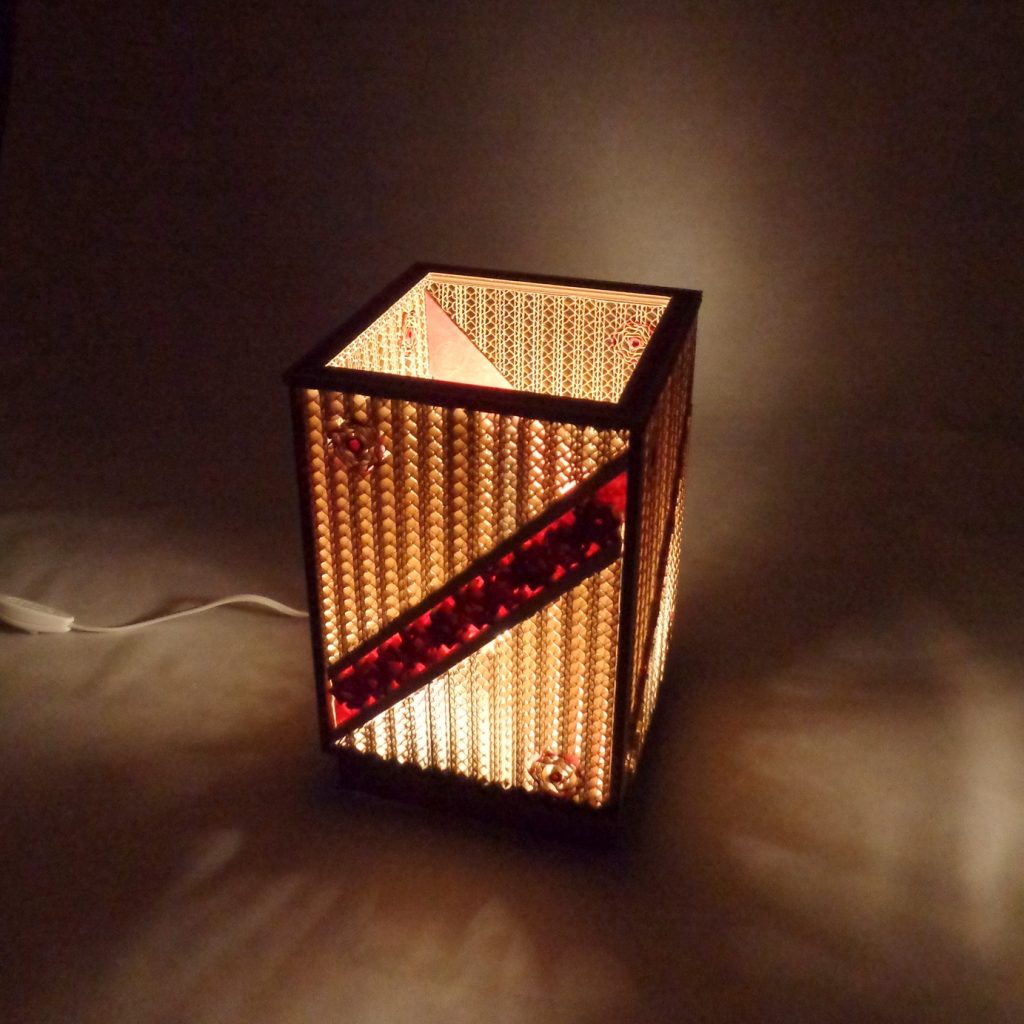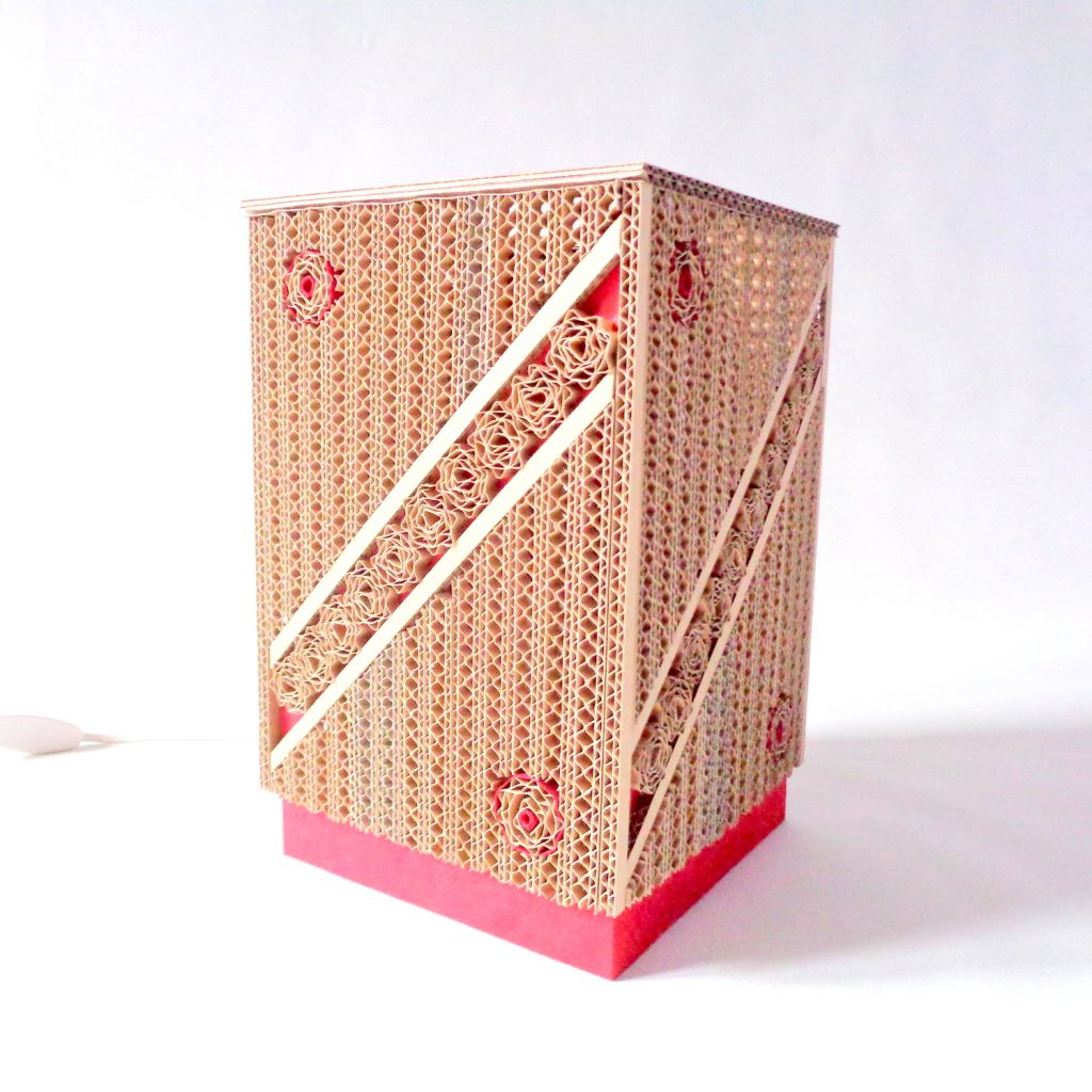 Une lampe rectangulaire en dentelle de carton et papier népalais.