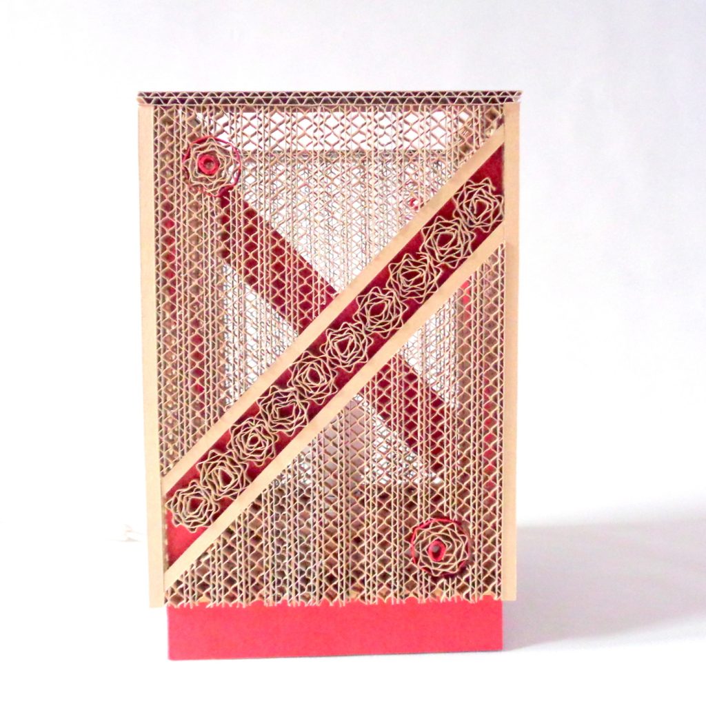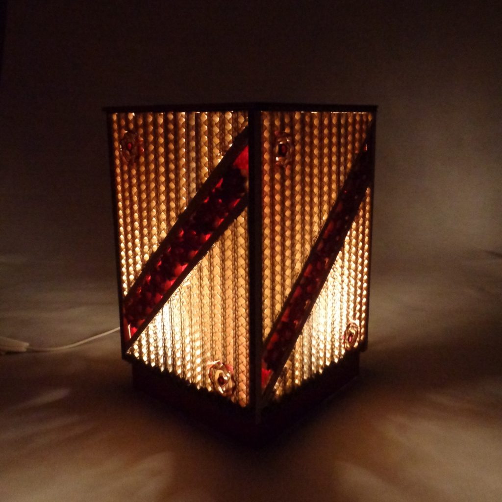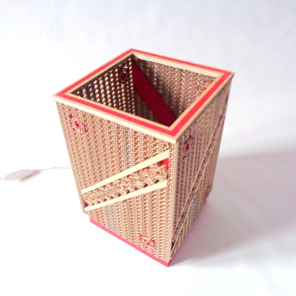 Cette lampe rectangulaire est créée à partir de carton de récupération et de papier népalais rouge carmin. Pièce unique réalisée entièrement à la main, toutes les lamelles de carton sont coupées au cutter. Elle est adaptée aux ampoules LED E14, basse consommation, qui ne chauffent pas.