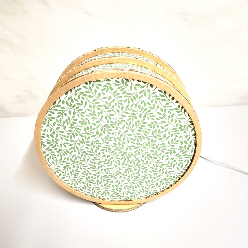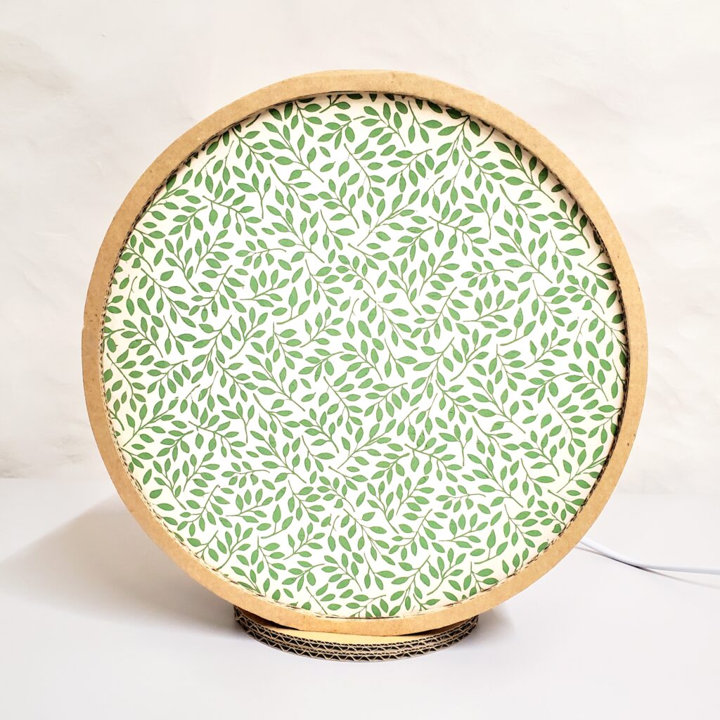 Des photos de la lampe « Tambourin » Blanche à feuilles vertes réalisée à la main en carton recyclé et papier népalais.