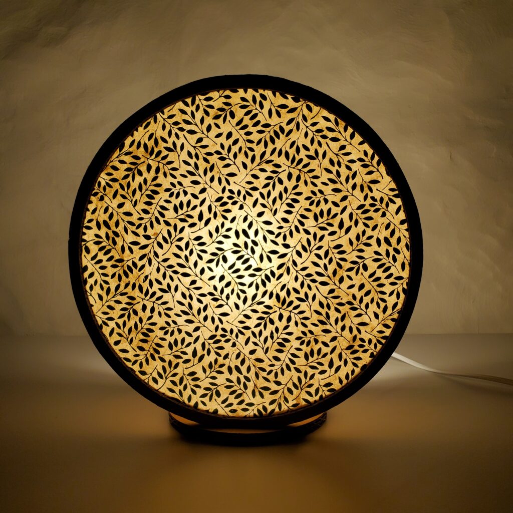 Entièrement réalisée à la main dans mon atelier, la lampe mesure 25 cm de diamètre et 11 cm de largeur. Elle est décorée avec du papier népalais collé sur du polyphane. Avec une ampoule LED E14, elle est une parfaite lampe d’ambiance qui mettra une touche de couleur et de chaleur dans votre intérieur.