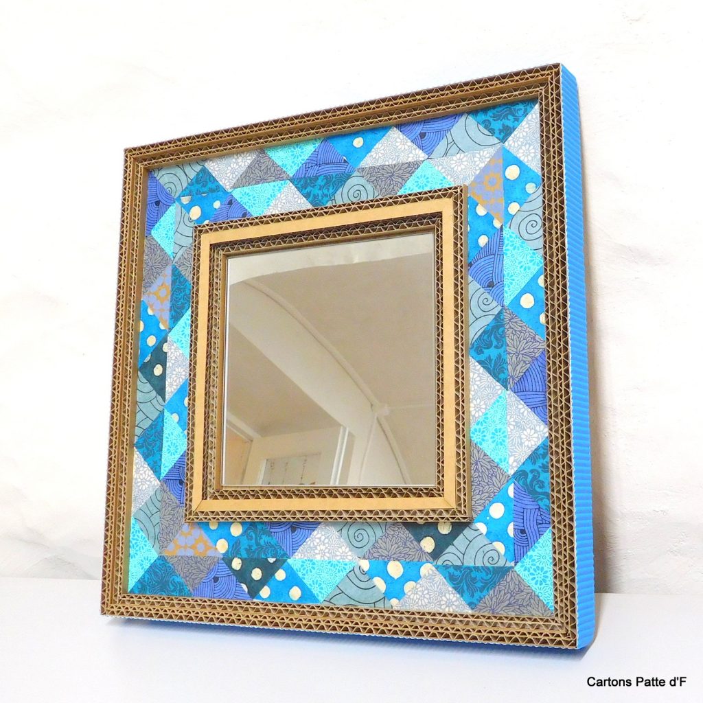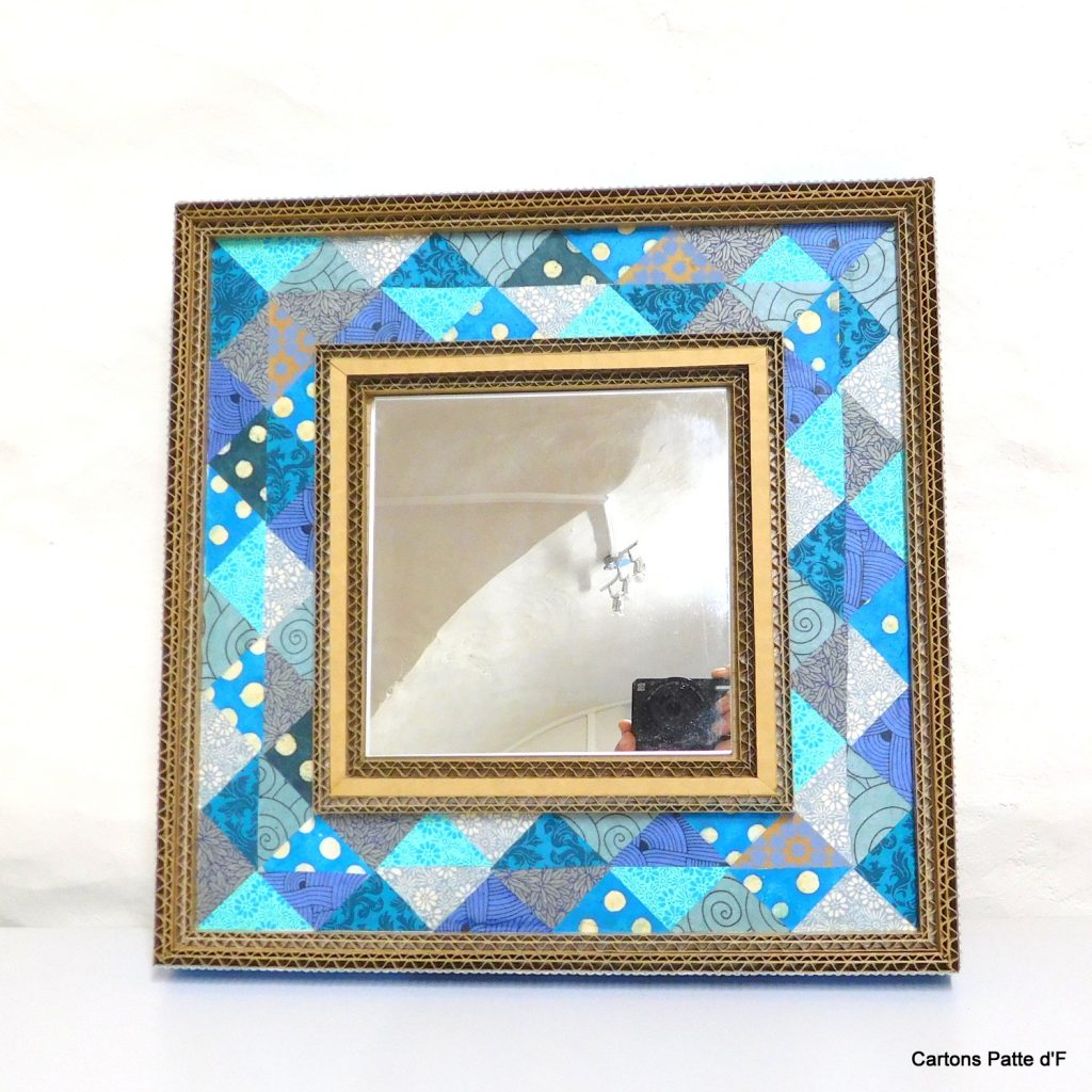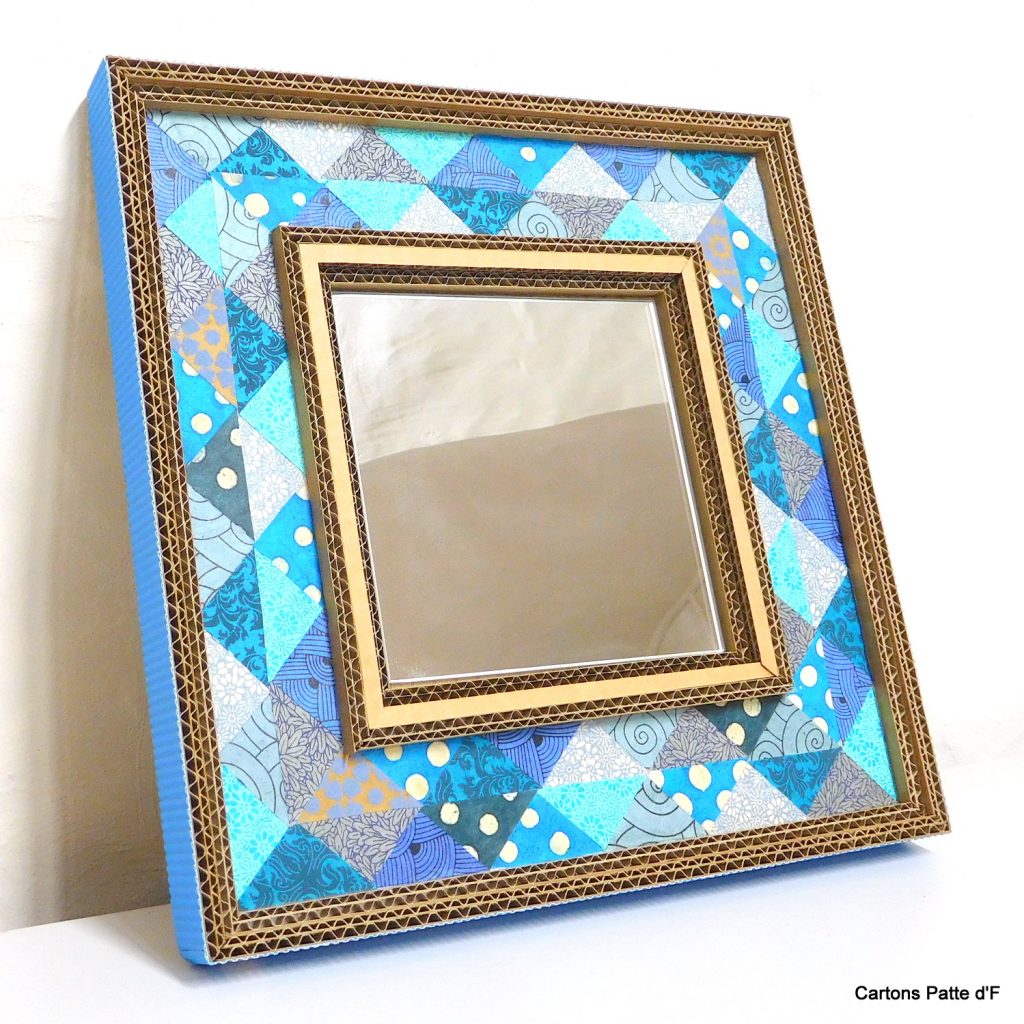 Un miroir tout en carton de récupération et papier népalais autour du bleu