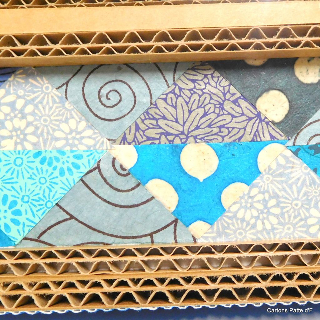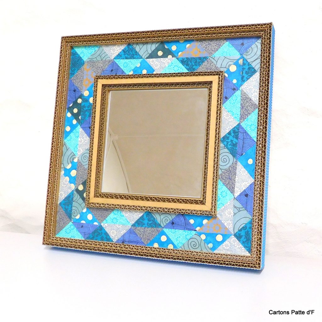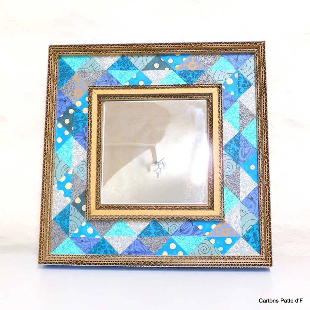 Un miroir tout en carton de récupération et papier népalais autour du bleu