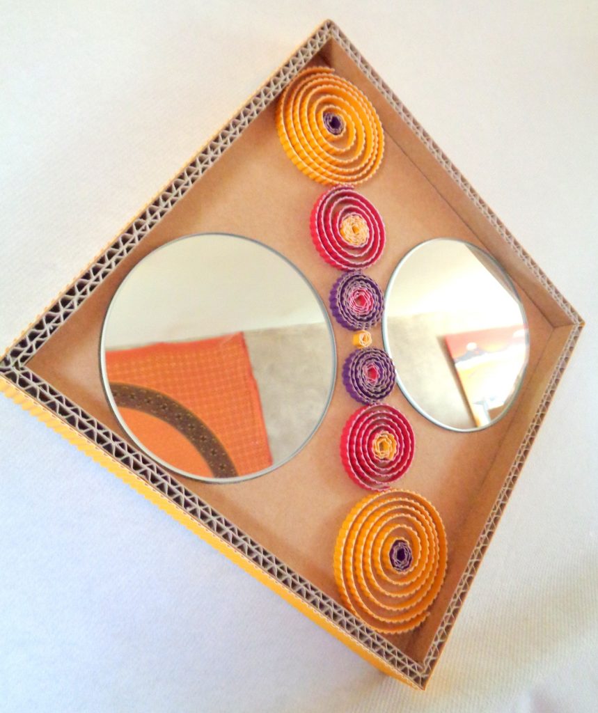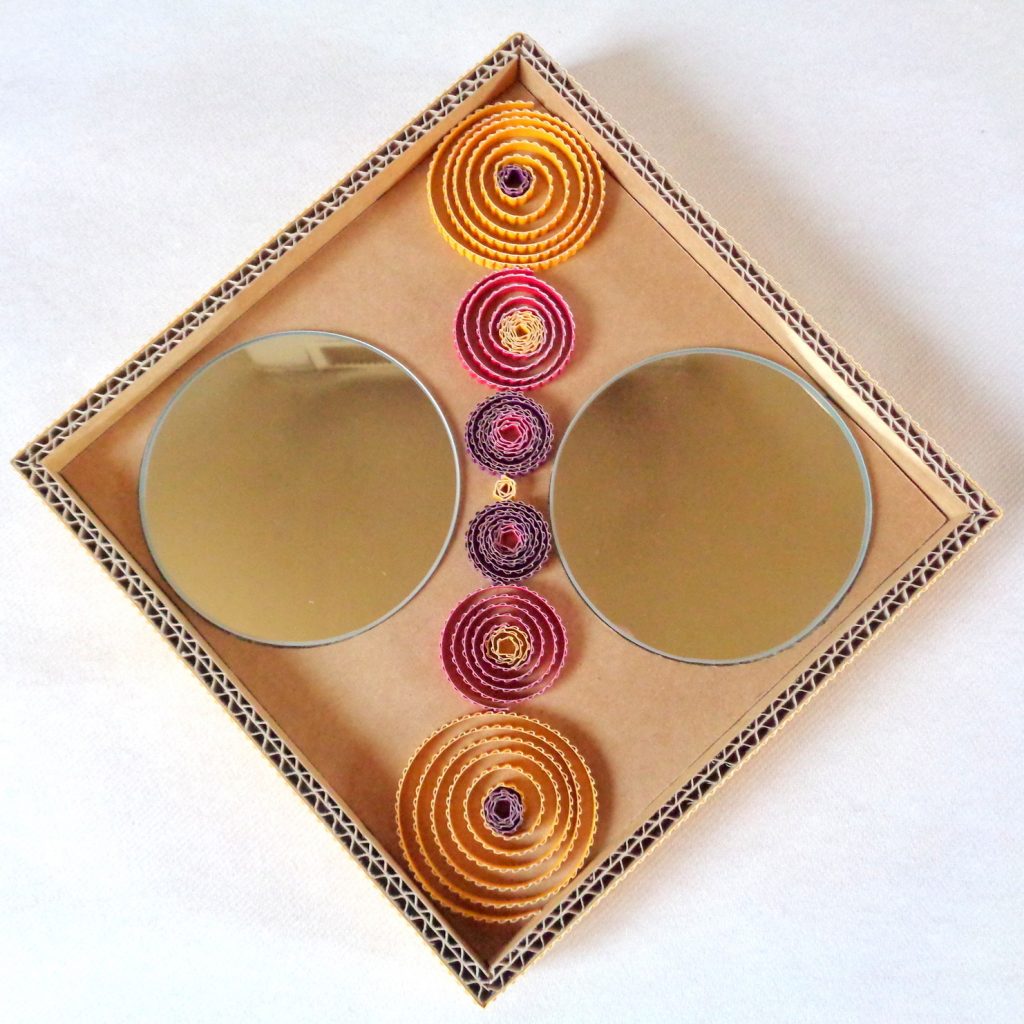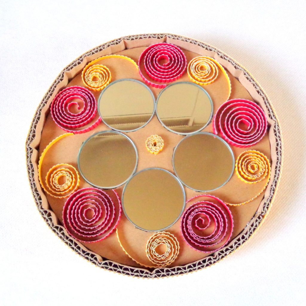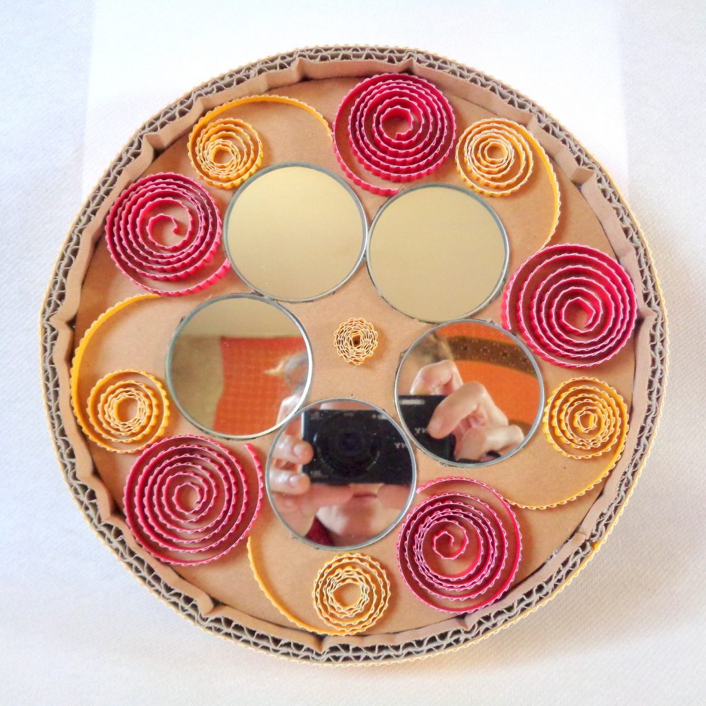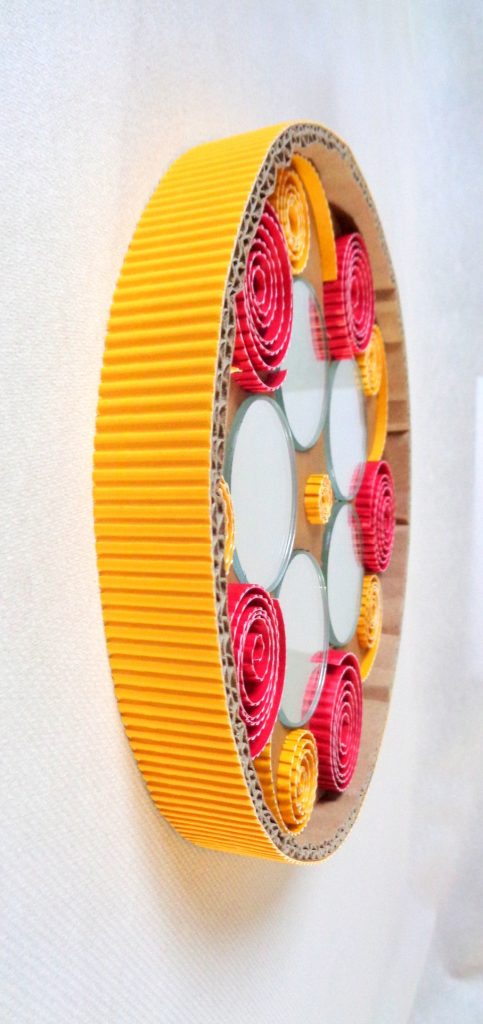 Miroir rond en dentelle de carton et carton ondulé : Spirales jaunes et rouges