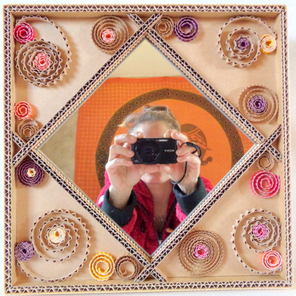 Des photos de miroirs en dentelle de carton crées à partir de carton double cannelure de récupération et de carton ondulé.