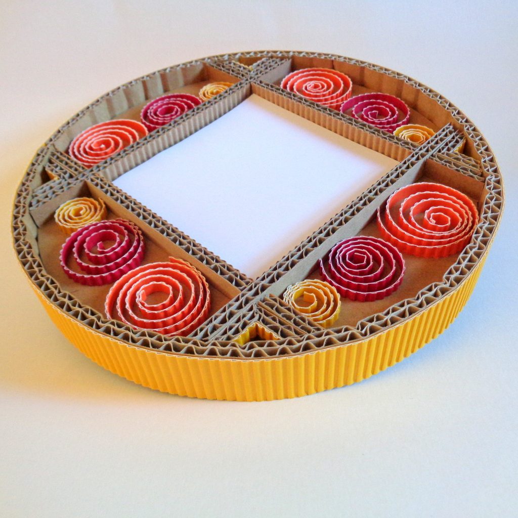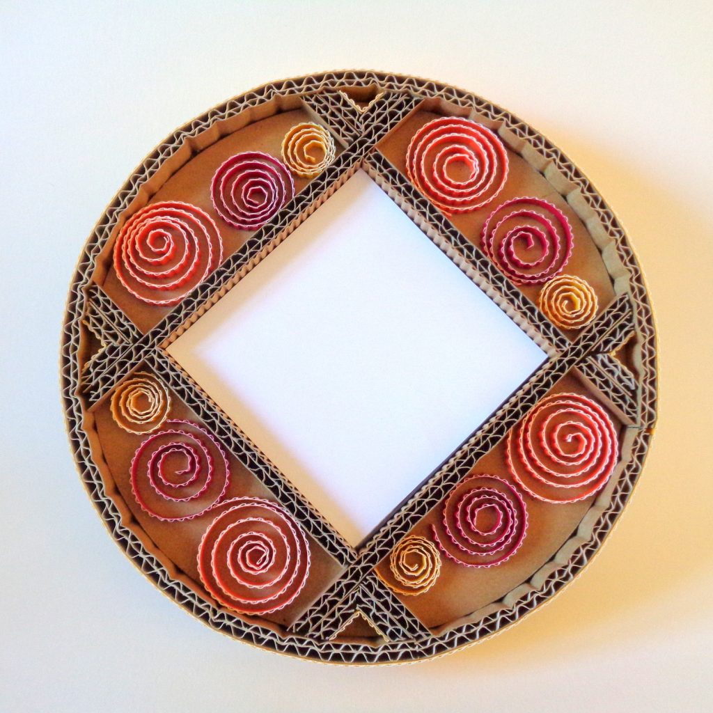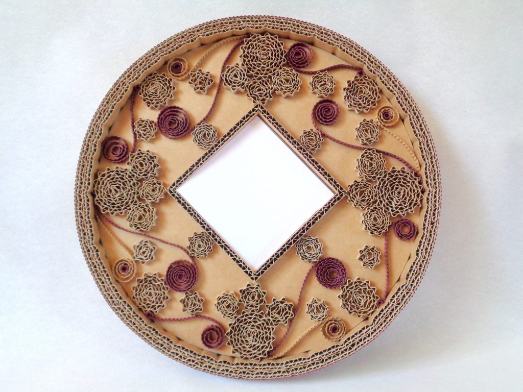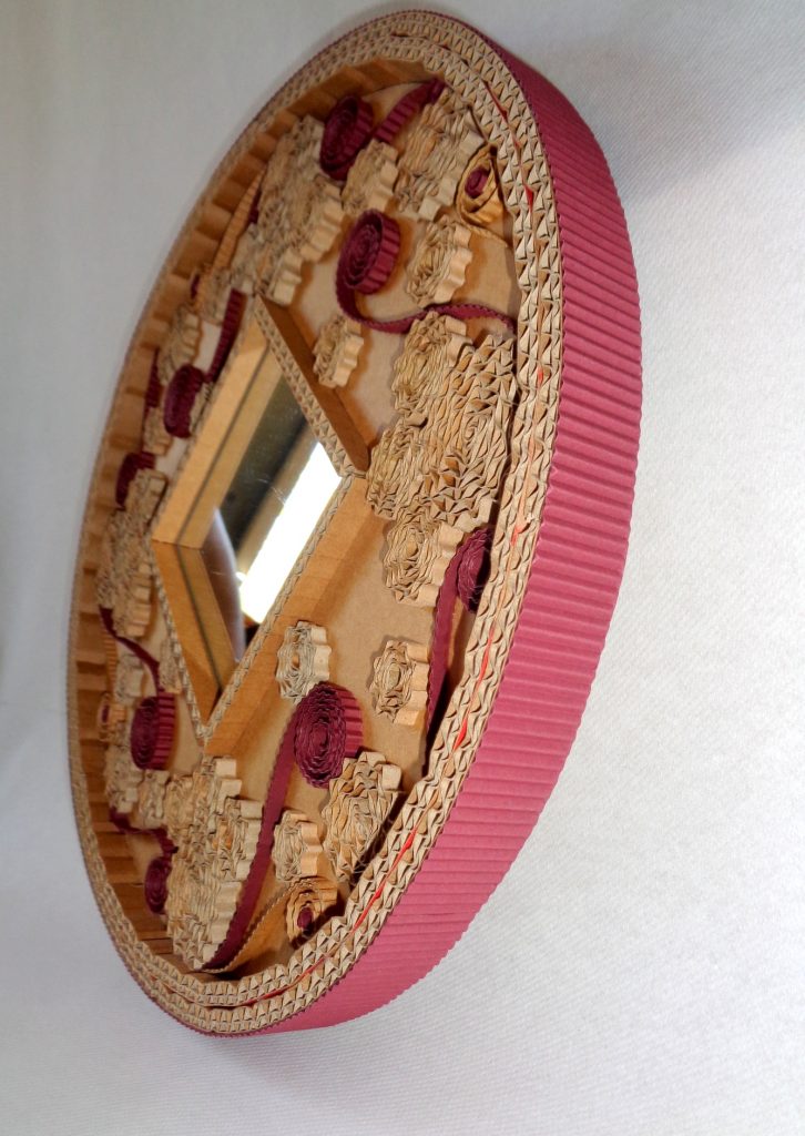 Des miroirs en dentelle de carton de récupération et carton ondulé coloré.