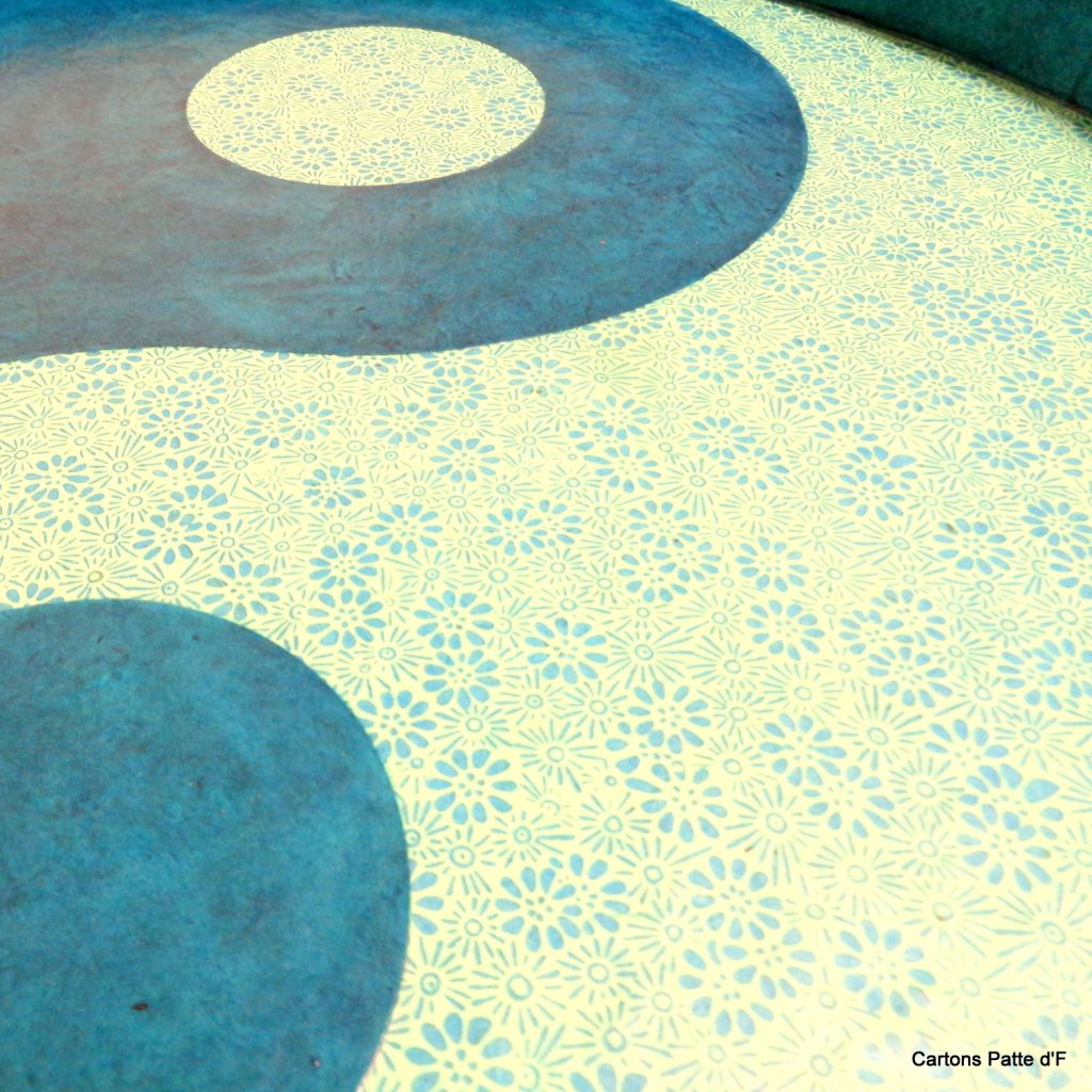 Recouvert de papier népalais Bleu turquoise et bleu à fleurs, issu du commerce équitable, il est ensuite vitrifié avec plusieurs couches de vitrificateur éco-labélisé. Le plateau est ainsi très fonctionnel, solide et résistant à l’humidité grâce à la vitrification.