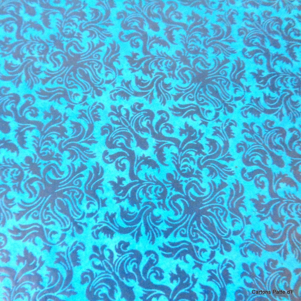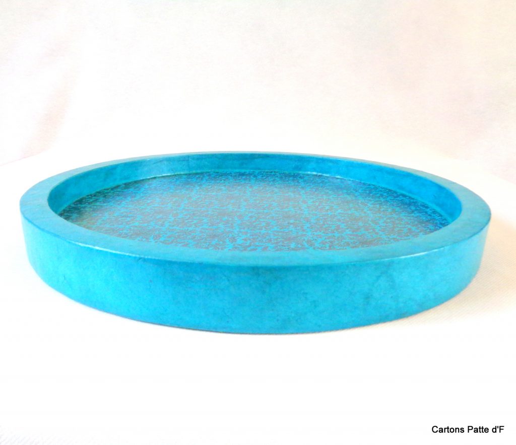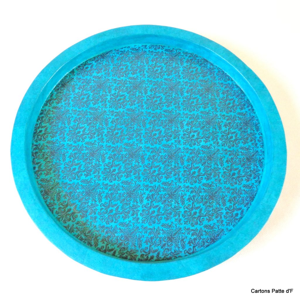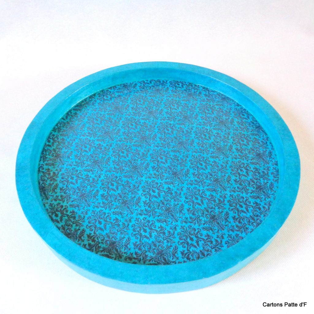 Quelques photos du plateau en carton « Bleu turquoise et bleu à motifs baroques noirs »