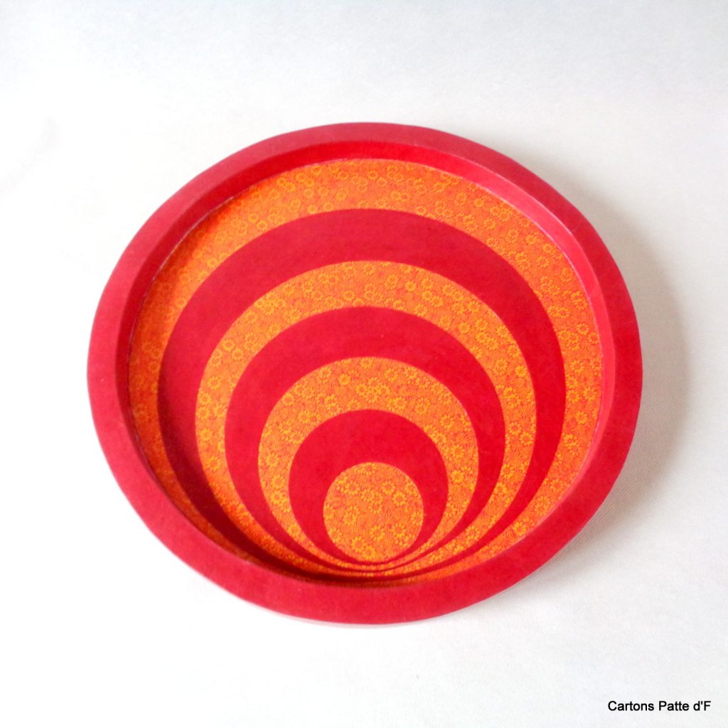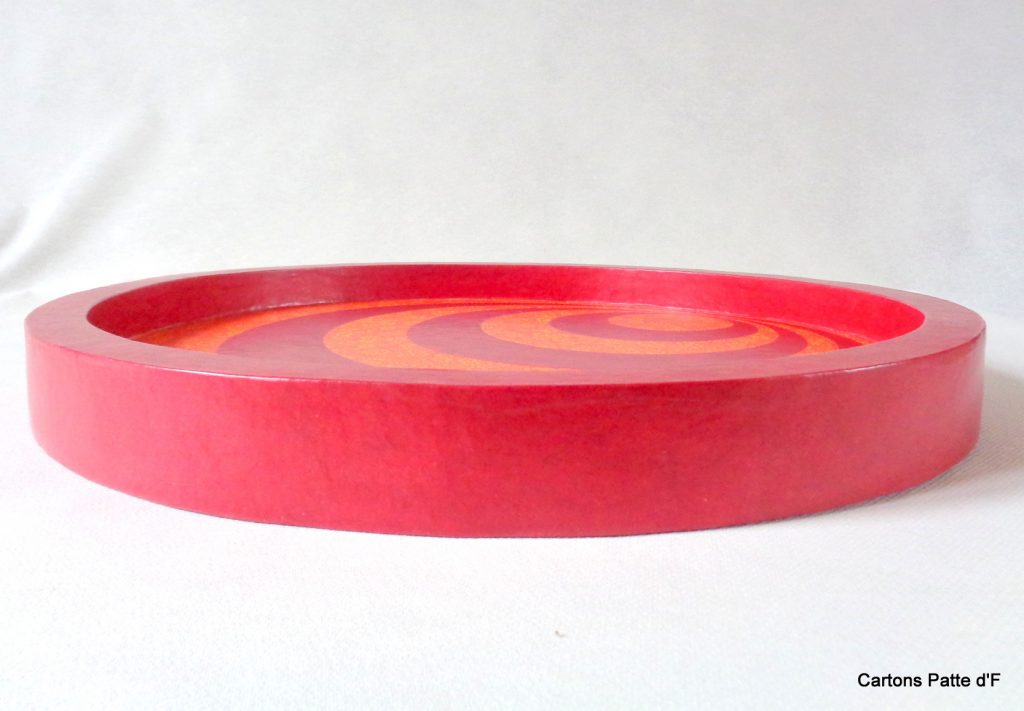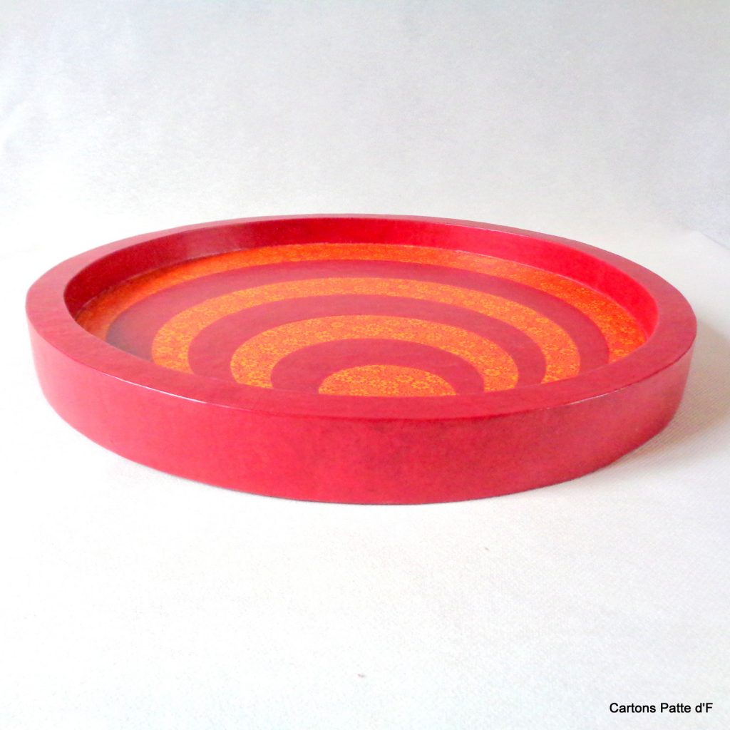 Le plateau est entièrement réalisé en carton de récupération et à la main. Recouvert de papier népalais « Rouge carmin et fleurs orange » issu du commerce équitable, il est ensuite vitrifié avec plusieurs couches de vitrificateur éco-labélisé. Il est ainsi fonctionnel, solide et résiste à l’humidité grâce à la vitrification. Il pourra être utilisé au quotidien et même être nettoyé avec une éponge humide au besoin, sans aucun problème.