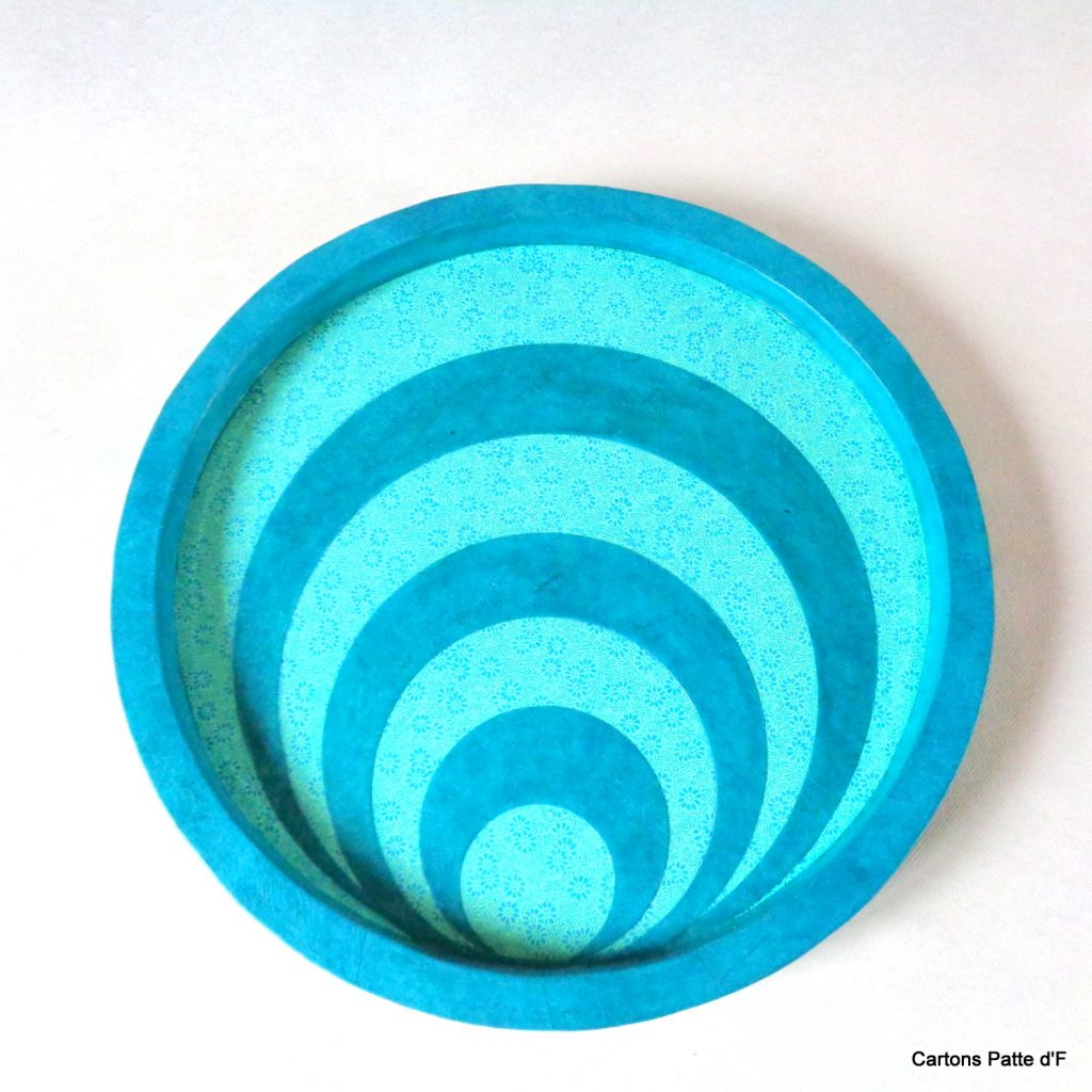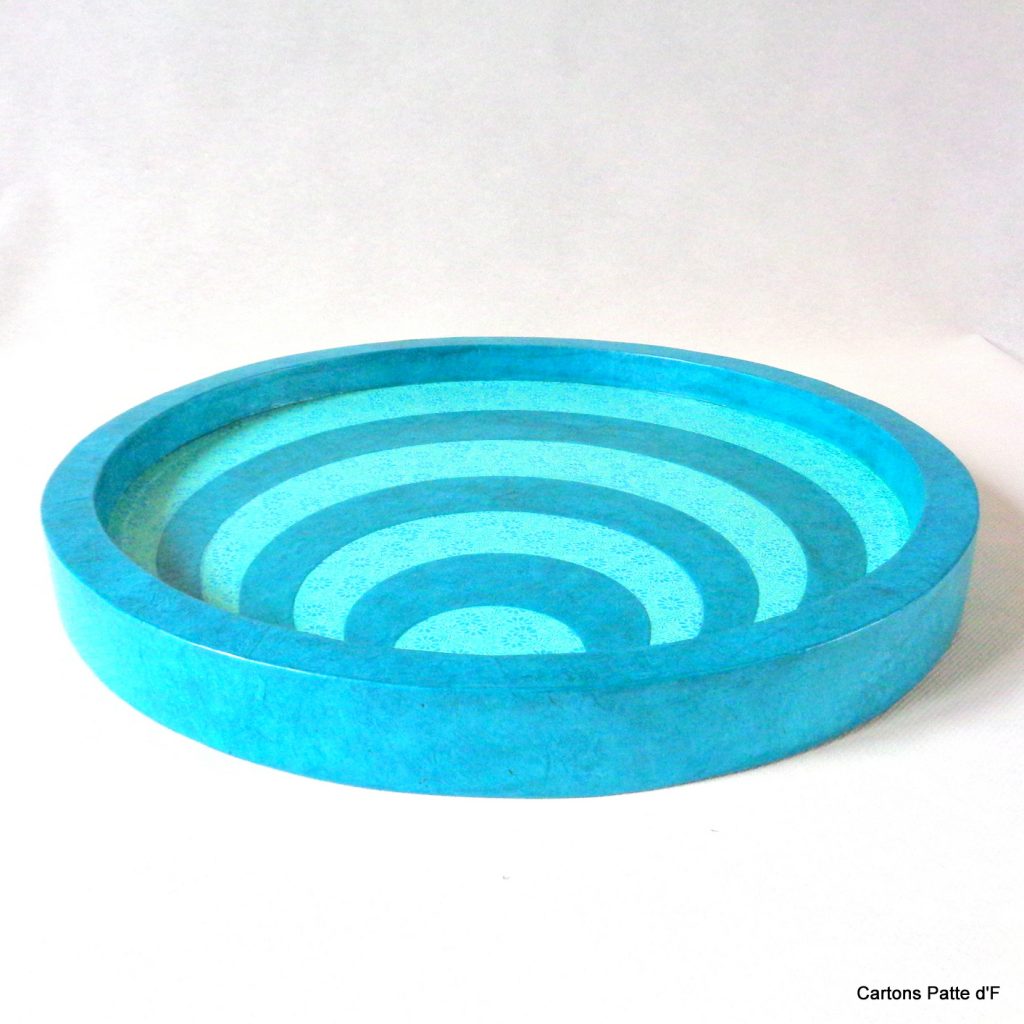 Les plateaux sont entièrement réalisés à la main en carton de récupération. Recouverts de papier népalais issu du commerce équitable, ils sont ensuite vitrifiés avec plusieurs couches de vitrificateur éco-labélisé. Les plateaux en carton sont ainsi fonctionnels, solides et résistent à l’humidité grâce à la vitrification. Ils pourront être utilisés au quotidien et même être nettoyés avec une éponge humide au besoin, sans aucun problème.
